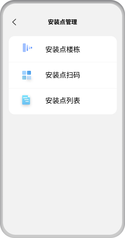 安裝點(diǎn)樓棟 用戶(hù)可在安裝點(diǎn)樓棟功能中,快速度創(chuàng )建樓棟以及樓層信息。 安裝點(diǎn)掃碼 用戶(hù)可在安裝點(diǎn)掃碼功能中,快速度掃描設備和綁定設備。 安裝點(diǎn)列表 用戶(hù)可在女裝點(diǎn)列表切能中,查看當前的設備狀態(tài)。